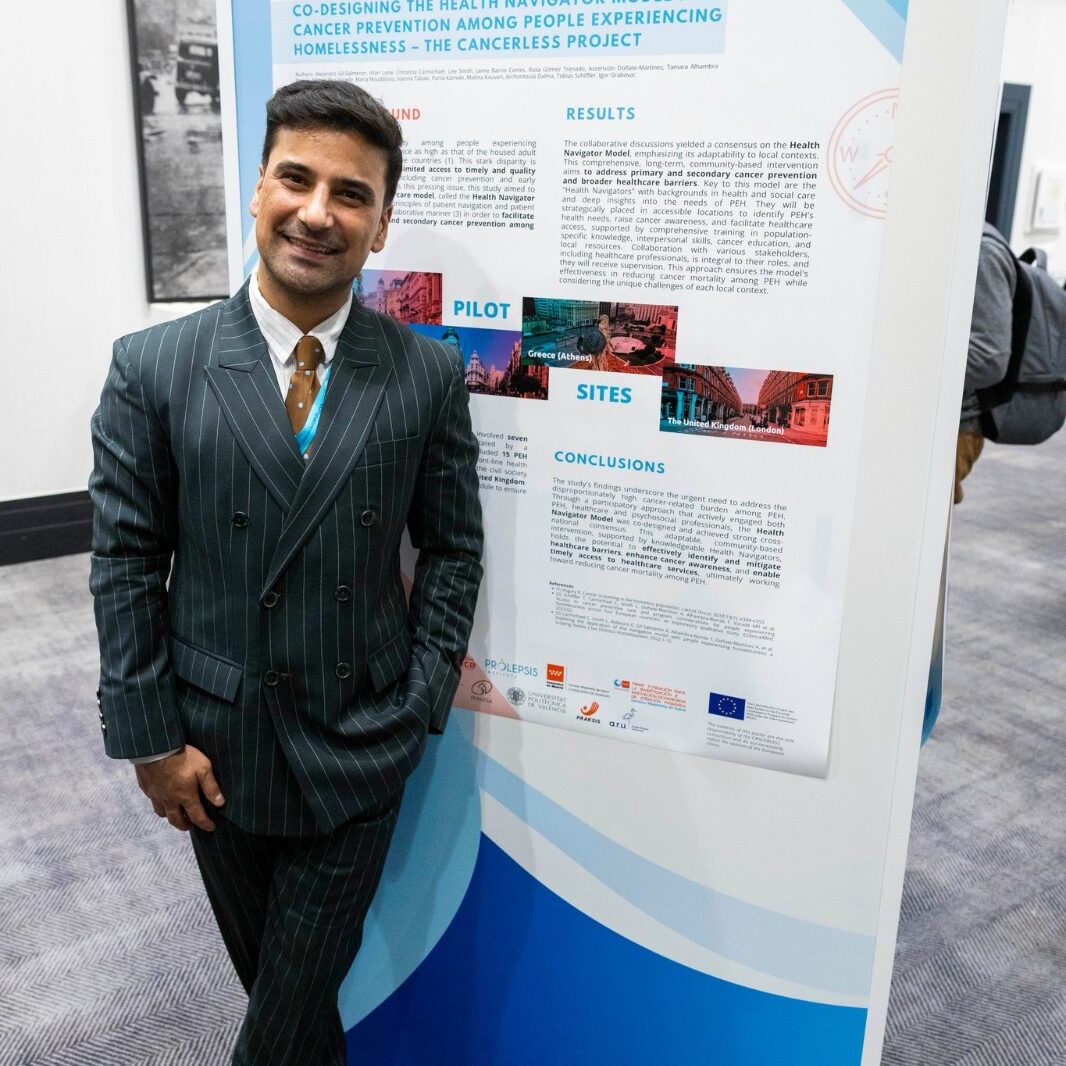- The research abstract of our project titled “Co-Designing the Health Navigator Model for Cancer Prevention Among People Experiencing Homelessness – the CANCERLESS Project” was selected for poster presentation. Throughout the summit, or colleague Irfan Lone who was representing CANCERLESS was asked to share more insights, background and knowledge about the project, and this was clearly due to the fact that delegates resonated to this and found this extremely relevant, as well as broader showcase in EU projects and Poster display areas.